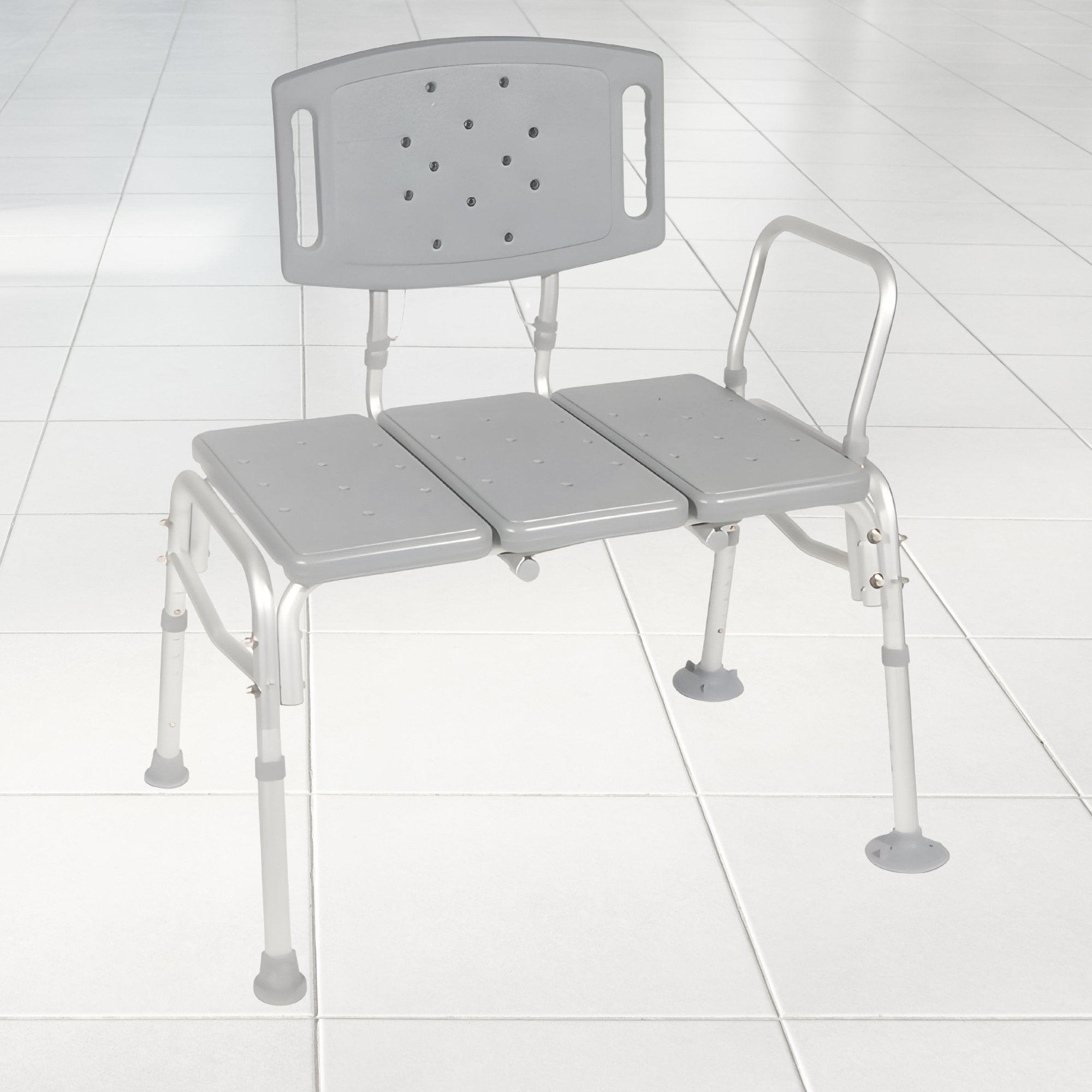 - Extended bench design and slip-resistant tips provide solution for safer transfer from a sitting position into and out of tub
