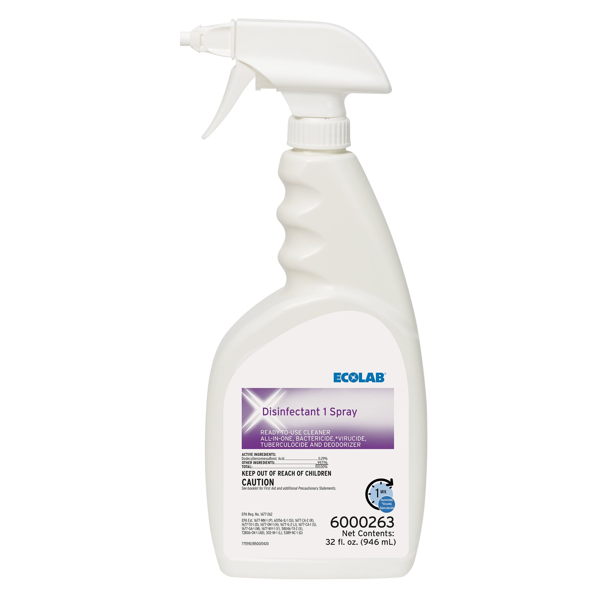 Ecolab Disinfectant 1 Surface Disinfectant Cleaner, 32 oz. Spray Bottle-Ecolab� Disinfectant 1 Surface Disinfectant Cleaner Bactericidal Pump Spray Liquid 32 oz. Bottle Sweet Scent NonSterile