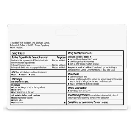 - 400 IU bacitracin; 3.5 mg neomycin and 5,000 IU polymyxin B per gram